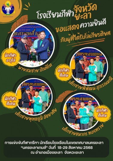 ขอแสดงความยินดีกับผู้ที่ได้รับโล่เกียรติยศ จากการแข่งขันกีฬากรีฑานักเรียนโรงเรียนในเขตเทศบาลนครยะลา...